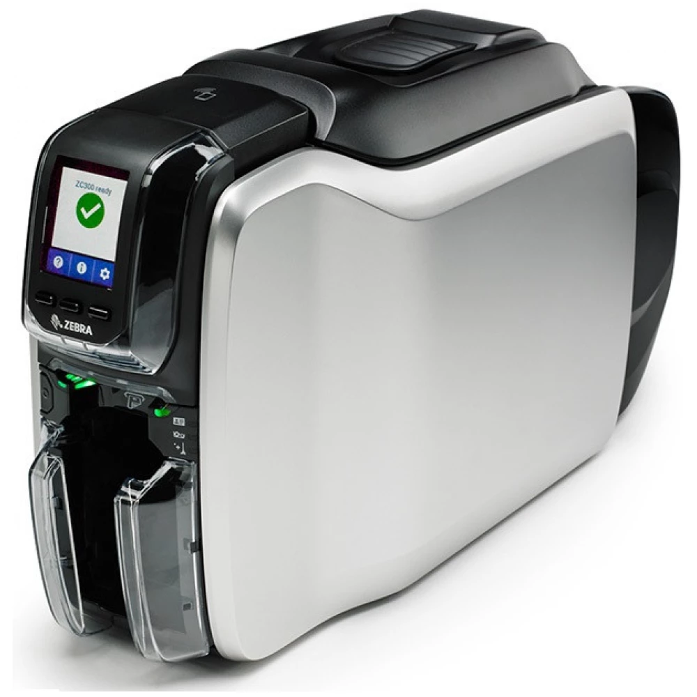 Zebra ZC300 card printer, double-sided, 12 dots/mm (300 dpi), USB, Ethernet, LCD display.